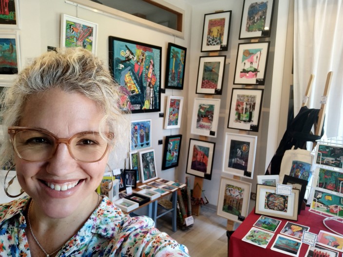 Artiste peintre franco-américaine, je laisse mon intuition me guider dans l'exploration d'une abstraction colorée. J'adore les couleurs vives et je travaille avec une technique mixte, utilisant peinture acrylique, encre, fusain, et des papiers peints que je crée moi-même.